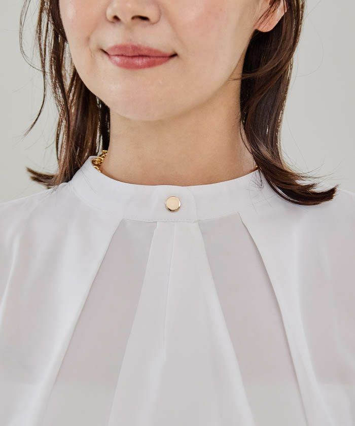 こちらのブラウスは、八分袖のタイプと共に私の定番で、色違い含め既に八枚目です。シルエットがキレイ(一枚で決まる、痩せてきた首元がカバーできる)お洗濯が楽(アイロン不要で乾きが早い)ゴールドボタンがアクセントになって金属アレルギーでもアクセサリー要らず、カラー展開も絶妙でとても気に入っています。仕事でもプライベートでも沢山着ています。ずっと残していただきたいアイテムです。