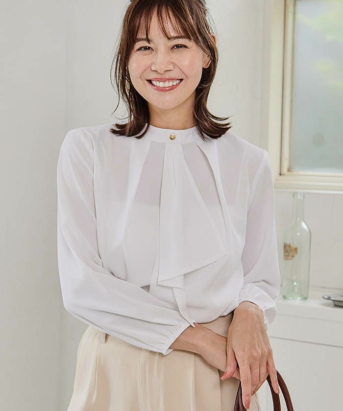 落ち着いた色合いと胸元のスカーフタイが大人っぽい印象のブラウス。