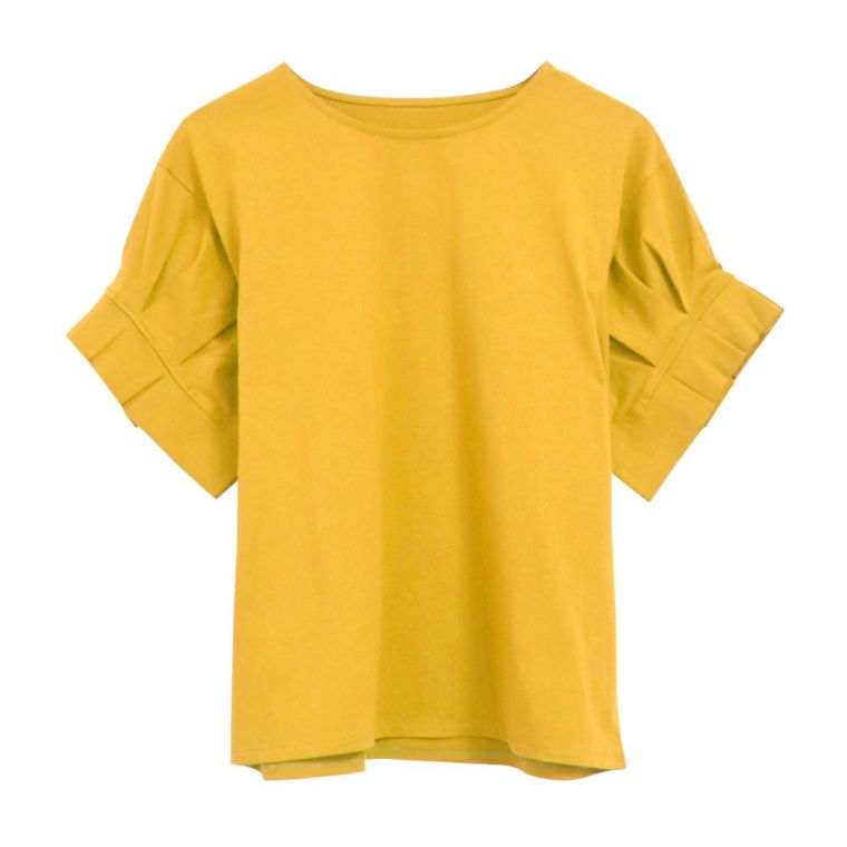 肩から大胆にタックを寄せた袖プリーツで二の腕をスッキリ華奢魅せ! コットン100%の程よい厚みの生地で体のラインを拾いにくい。 首元はクルーネックですっきりとバランスを持たせたデザインです。