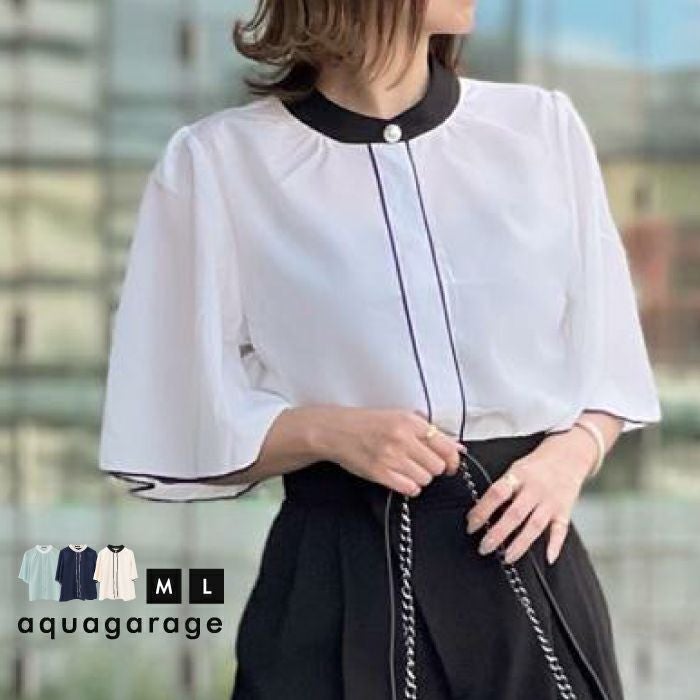 送料無料 パール釦バイカラーフレア5分袖ブラウス 春 夏 M L ≪ゆうメール便配送10・代引不可≫ | アクアガレージ aquagarage