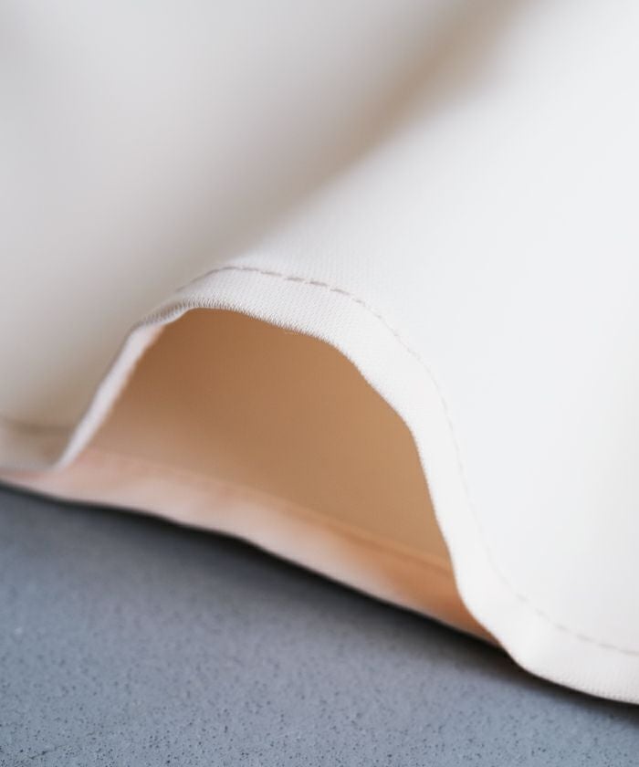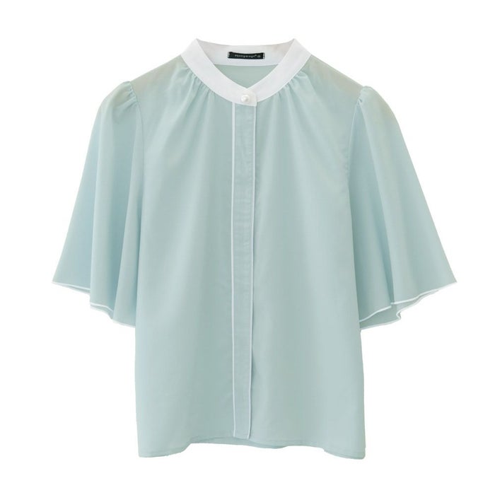 フレア袖と首元のパール釦が女性っぽく、大人可愛い印象に。