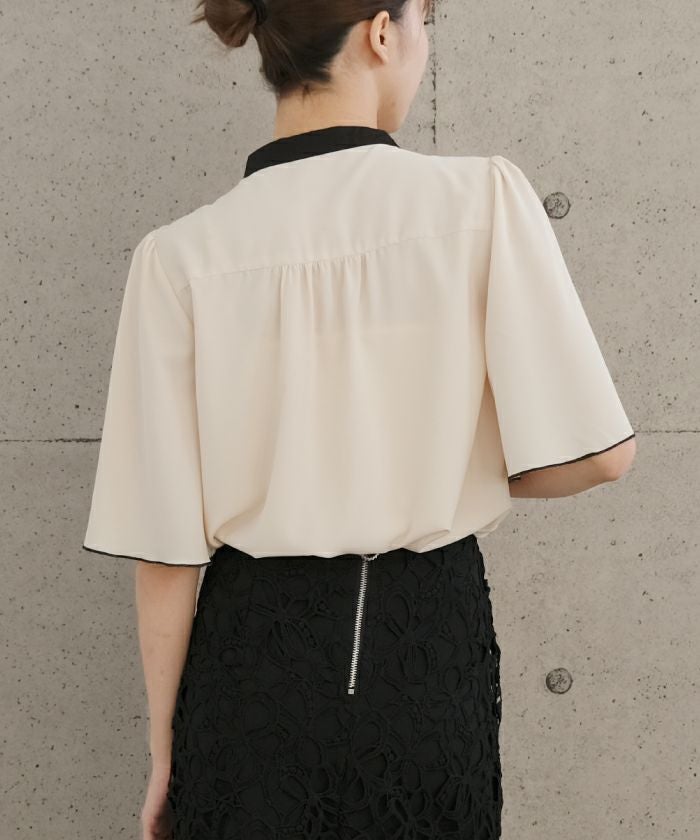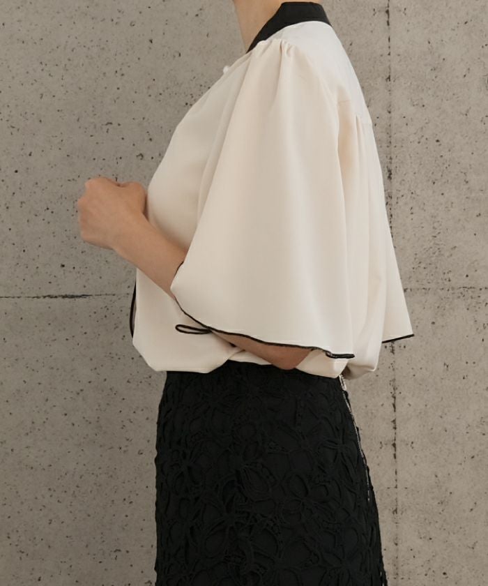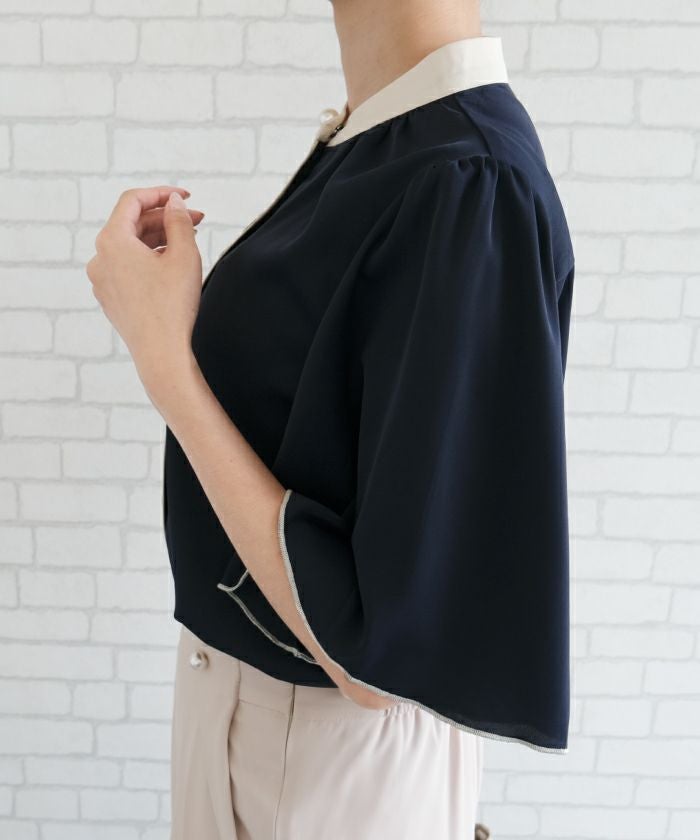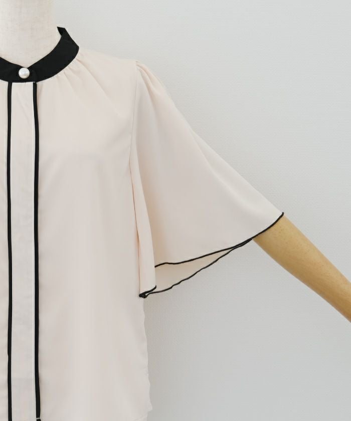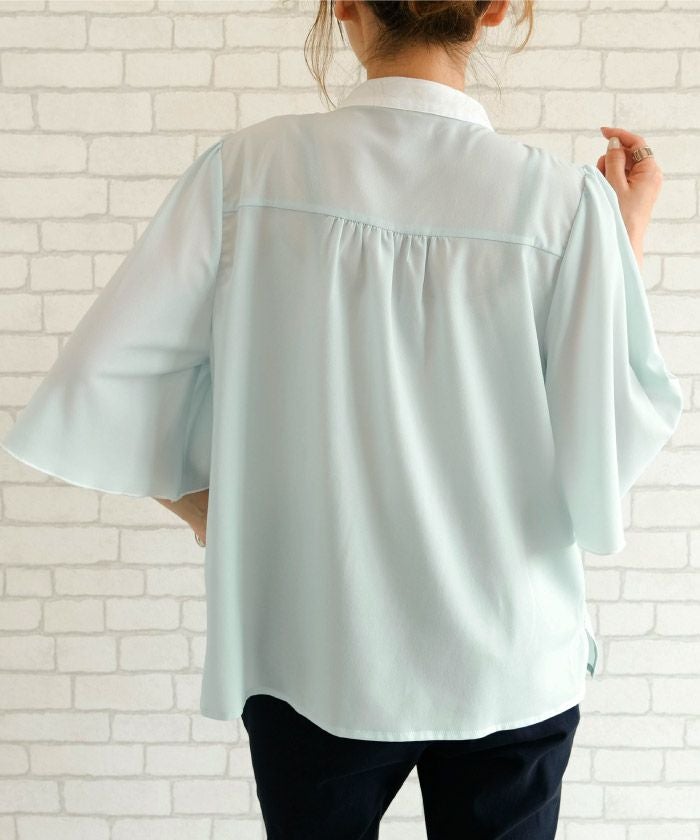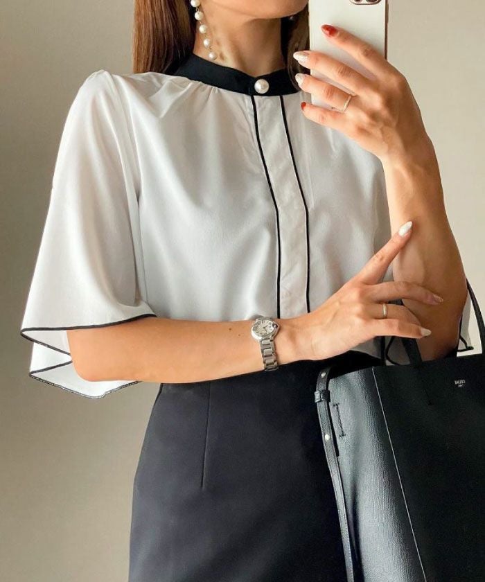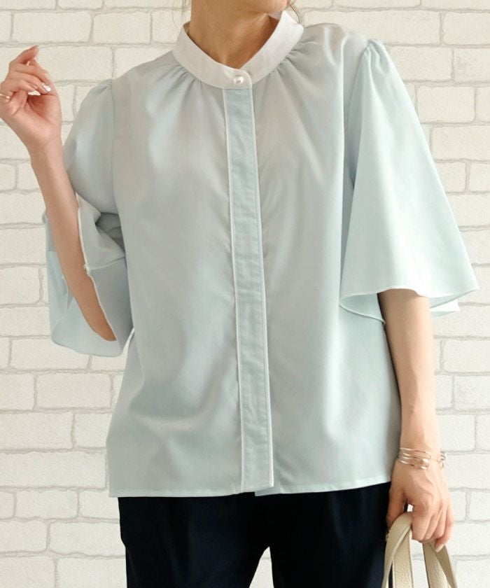 • ふわりと揺れるフレア袖が上品な魅力を引き立てる!パール釦バイカラーフレア5分袖ブラウス