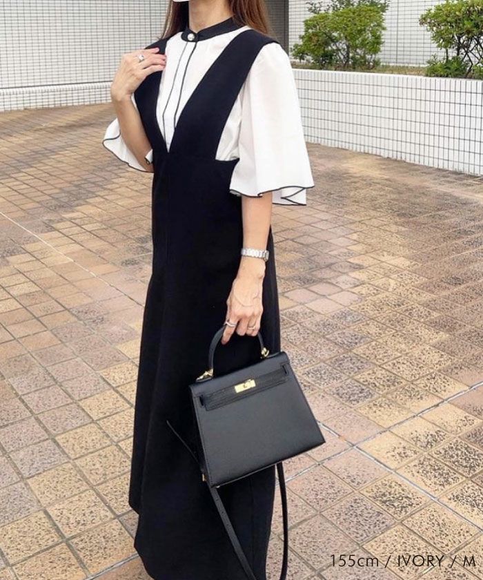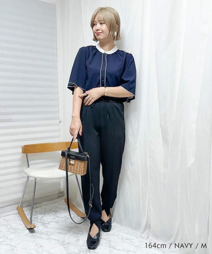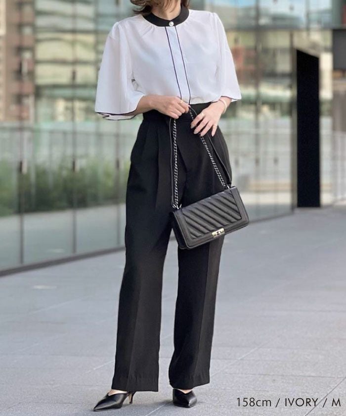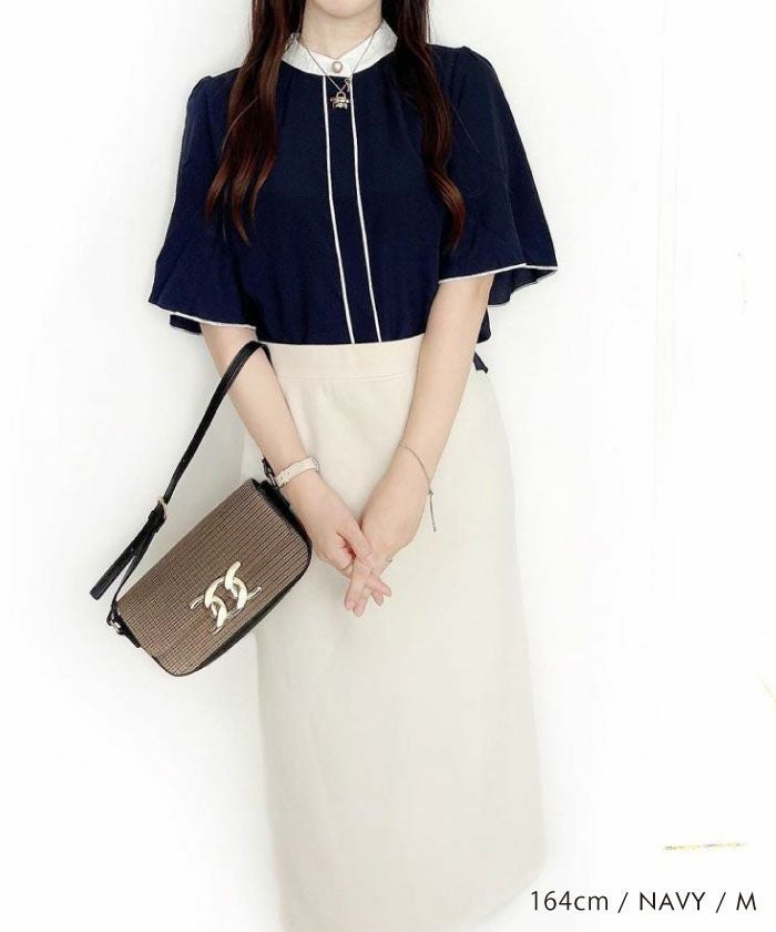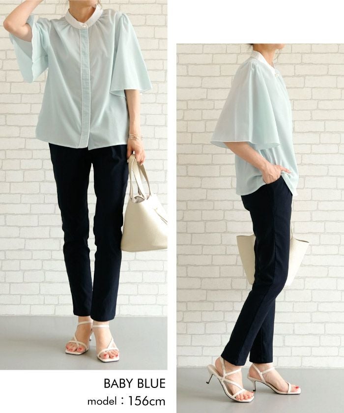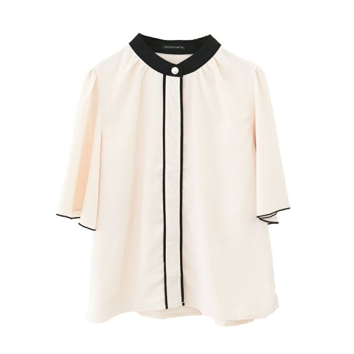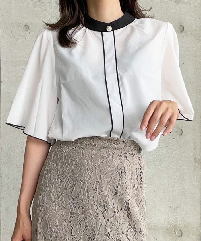 • ふわりと揺れるフレア袖が上品な魅力を引き立てる!パール釦バイカラーフレア5分袖ブラウス