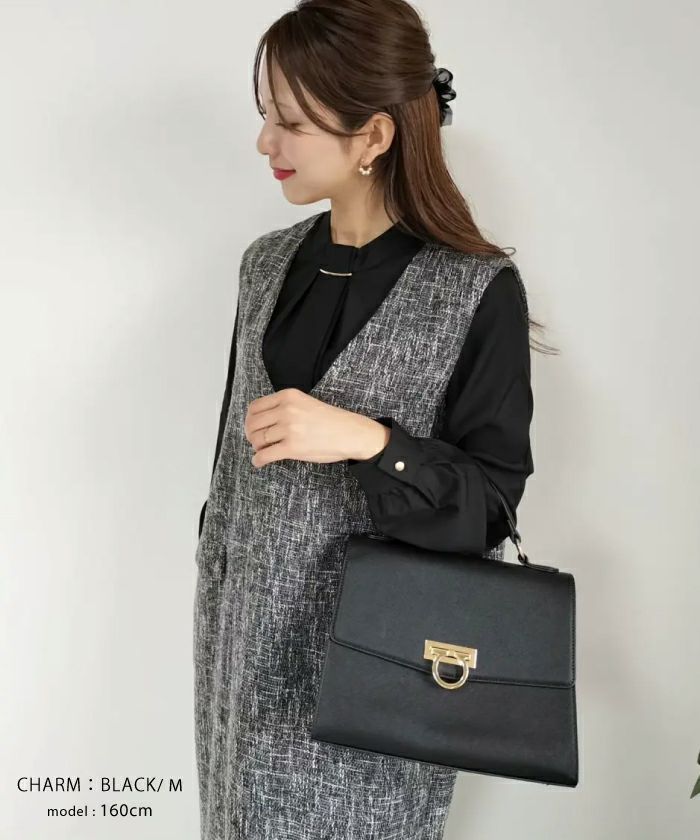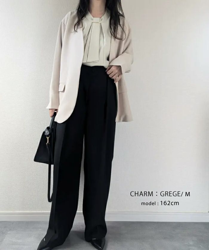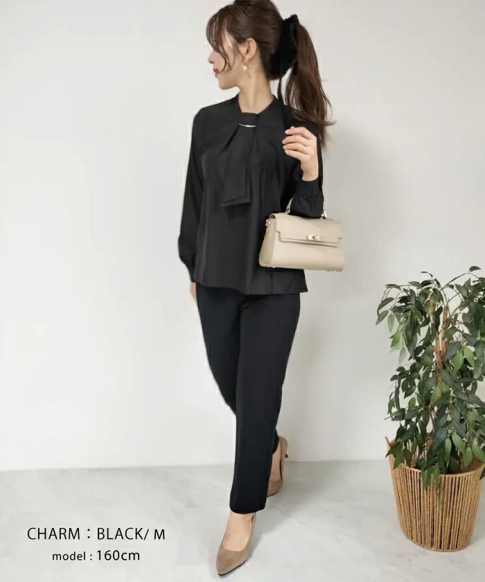 白のワイドパンツに合わせるブラウスを探していたら今流行りのボウタイブラウスでカワイイのがあったので購入しました。パ-ルにしようか?チャームにしようか?迷いましたが黒のチャームにしました。年齢的に落ち着いていてオシャレ感があるチャームにして正解でした。