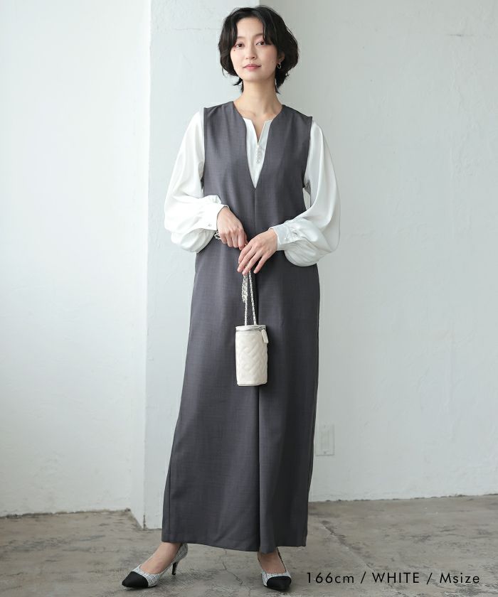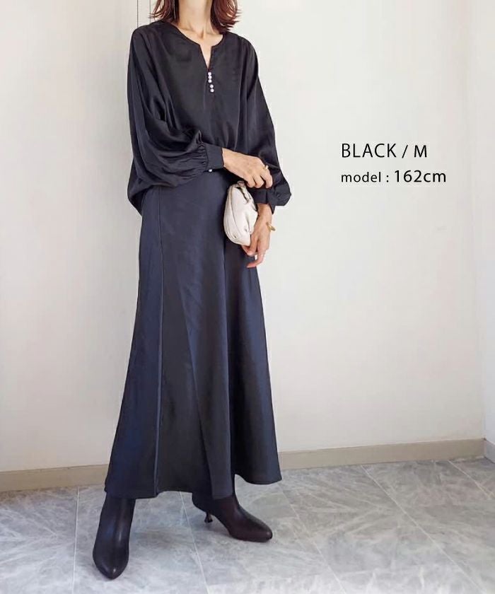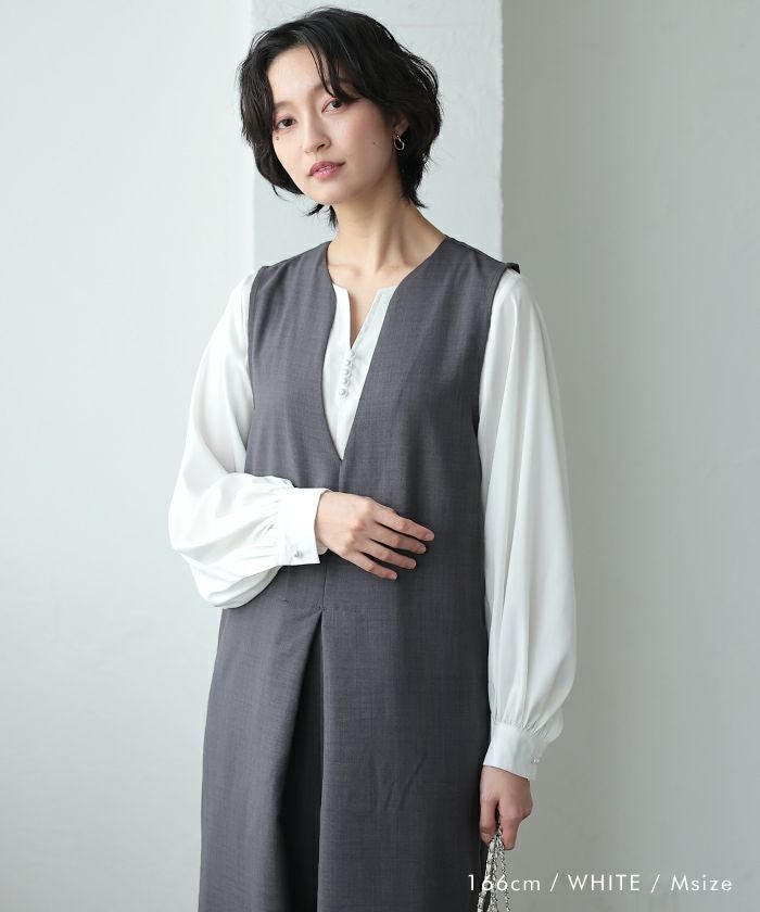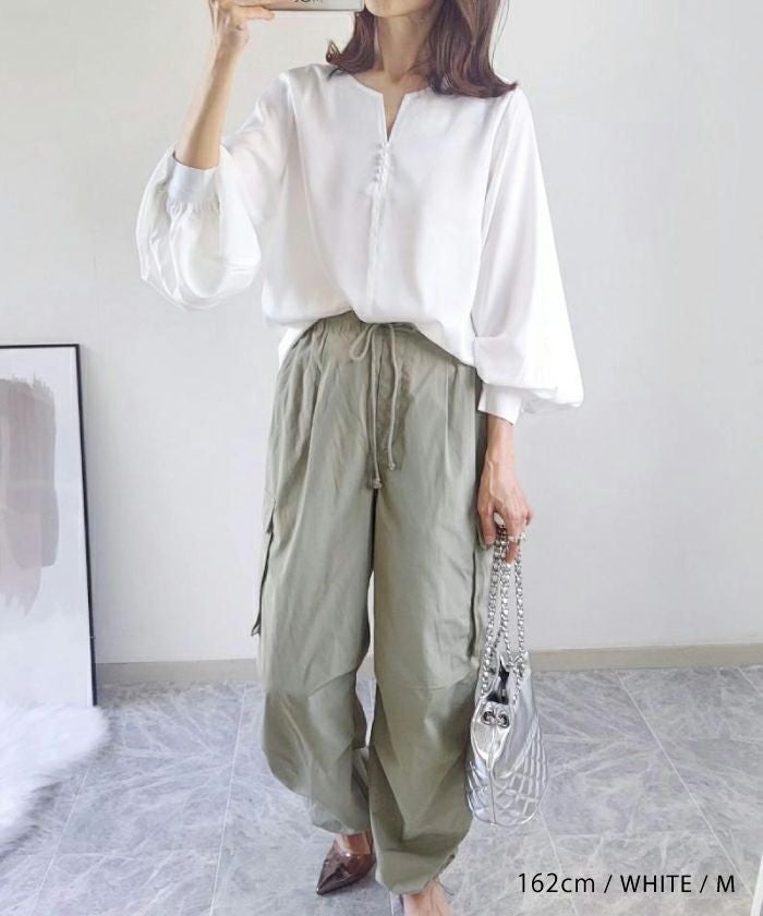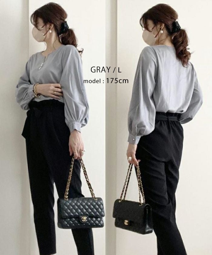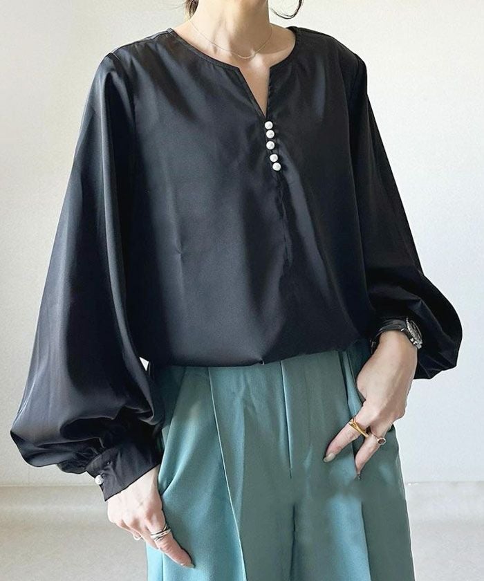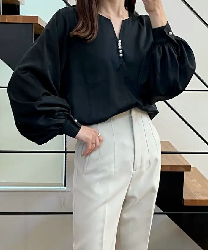 • ネックレスいらずの華やかなデザイン♪キーネックパールボタンブラウス