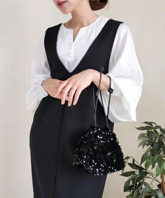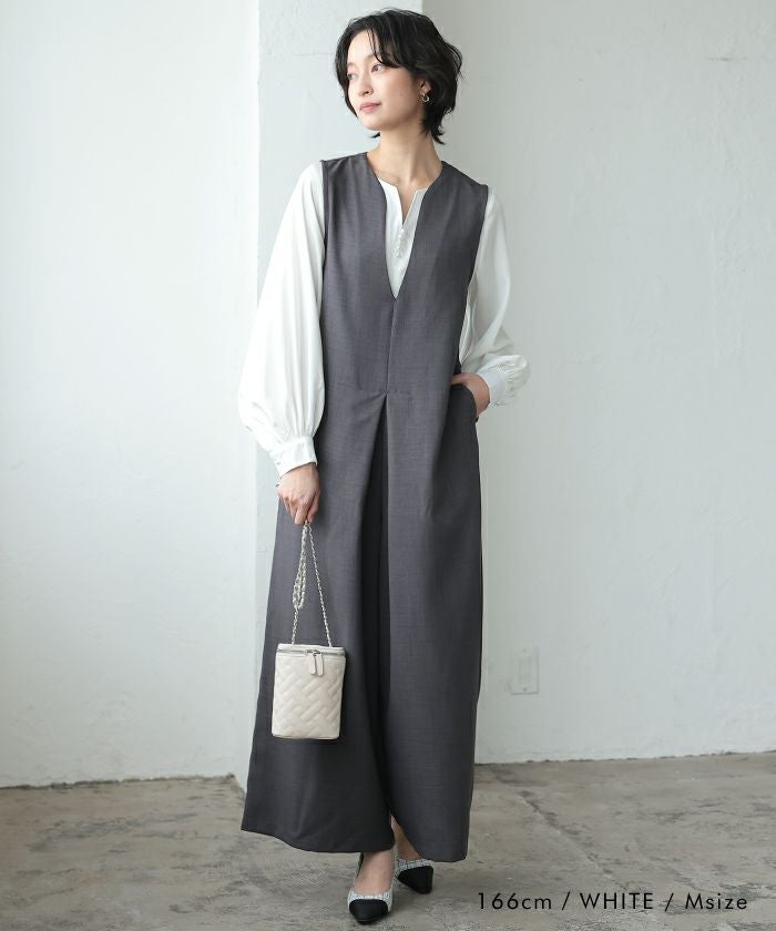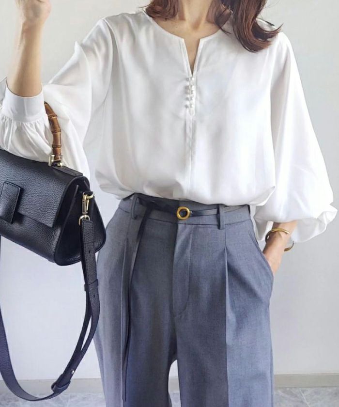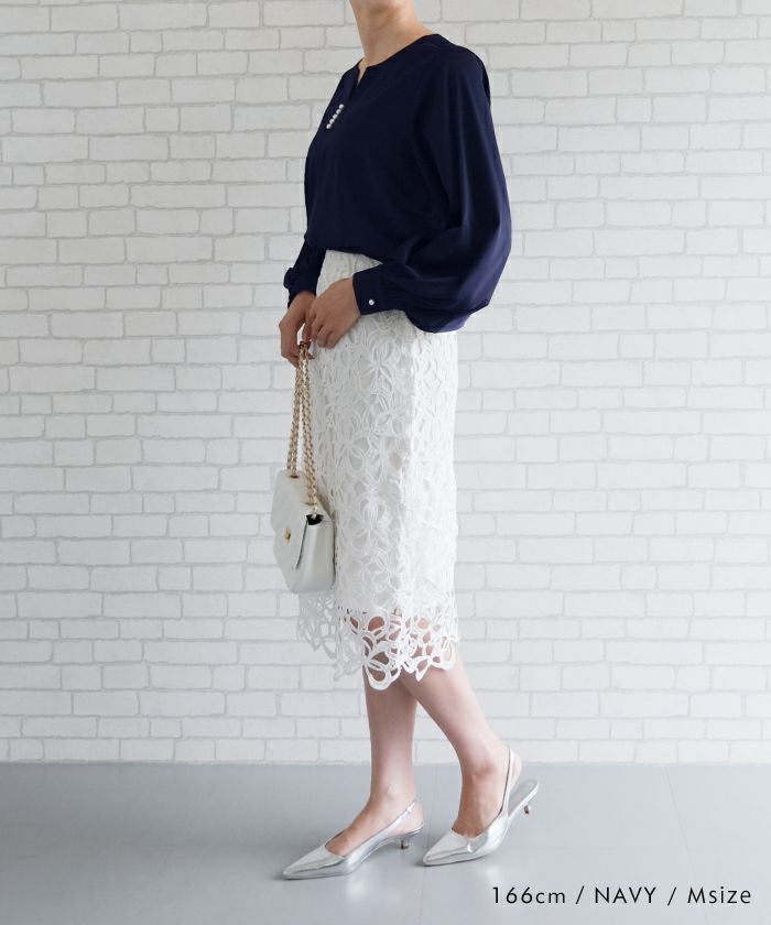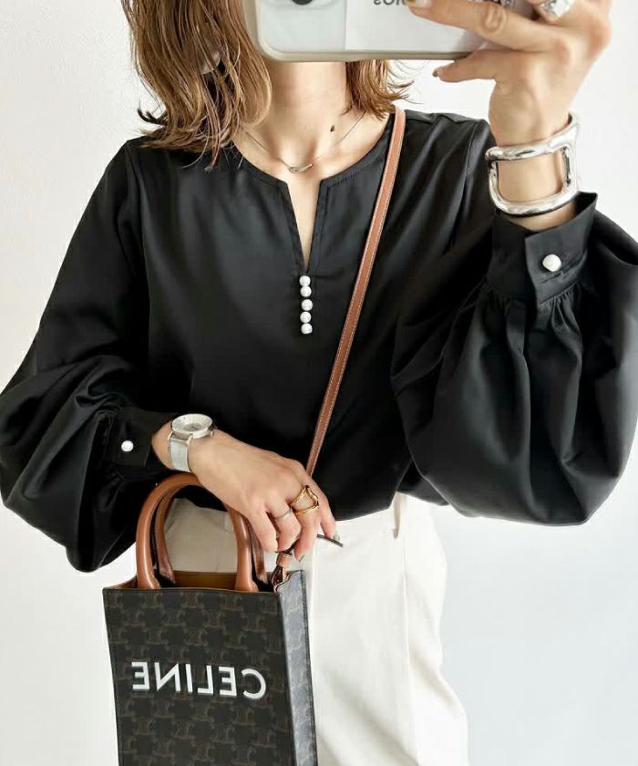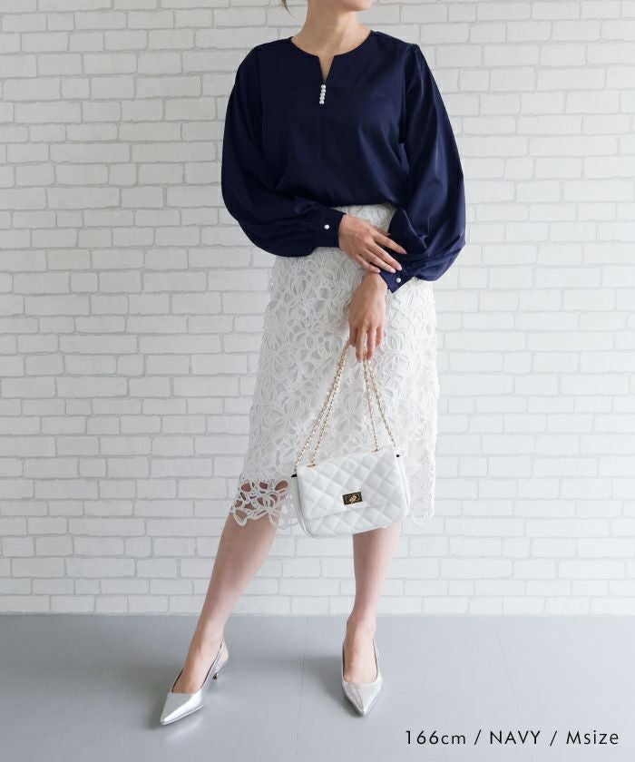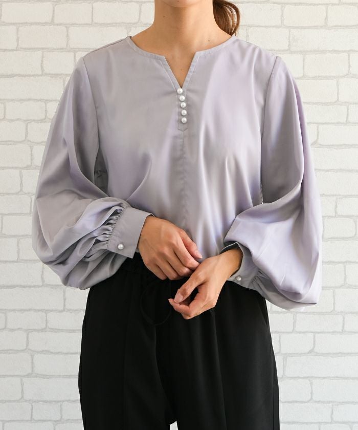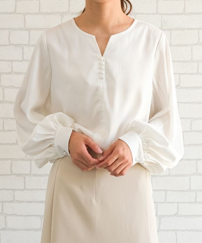 上品見えの浅めキーネックにパールをあしらったブラウス。