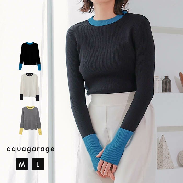 送料無料 指穴付きバイカラーリブニット 春 秋 冬 M L レディース ≪ゆうメール便配送30・代引不可≫ | | アクアガレージ aquagarage
