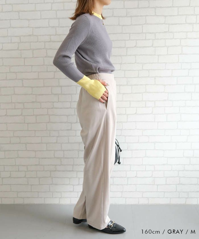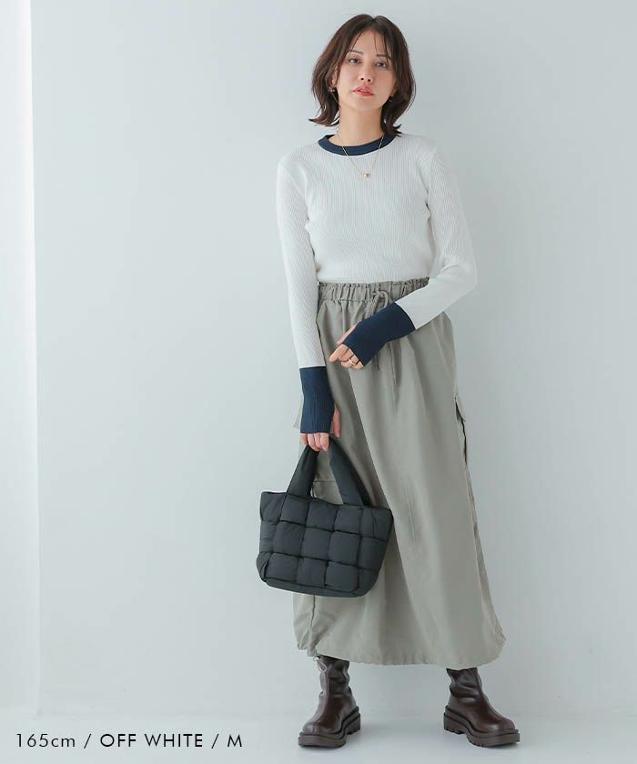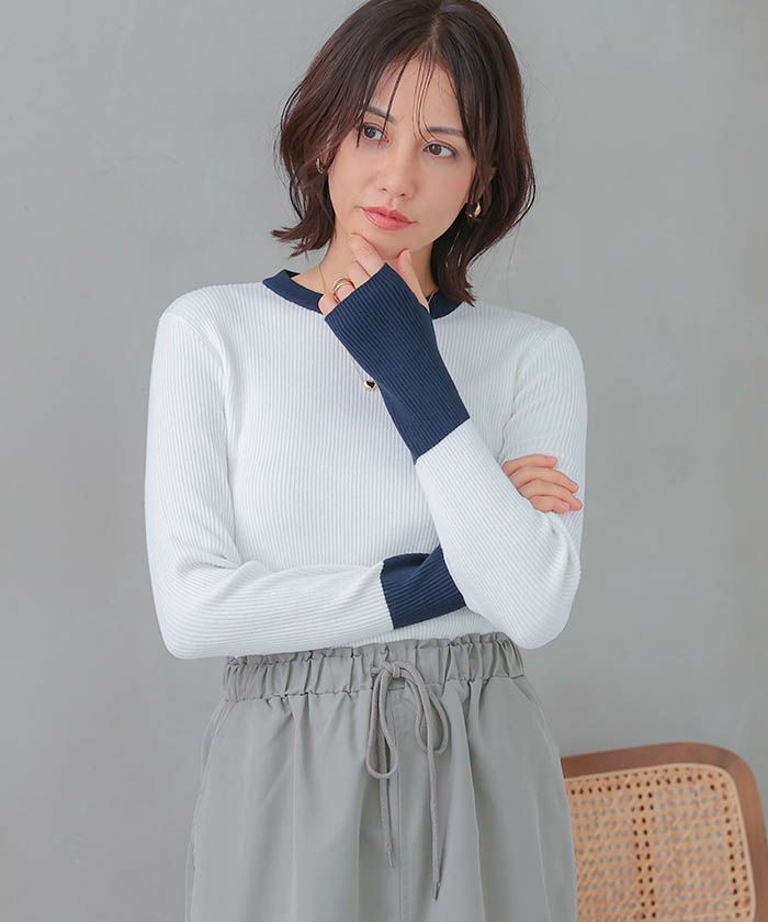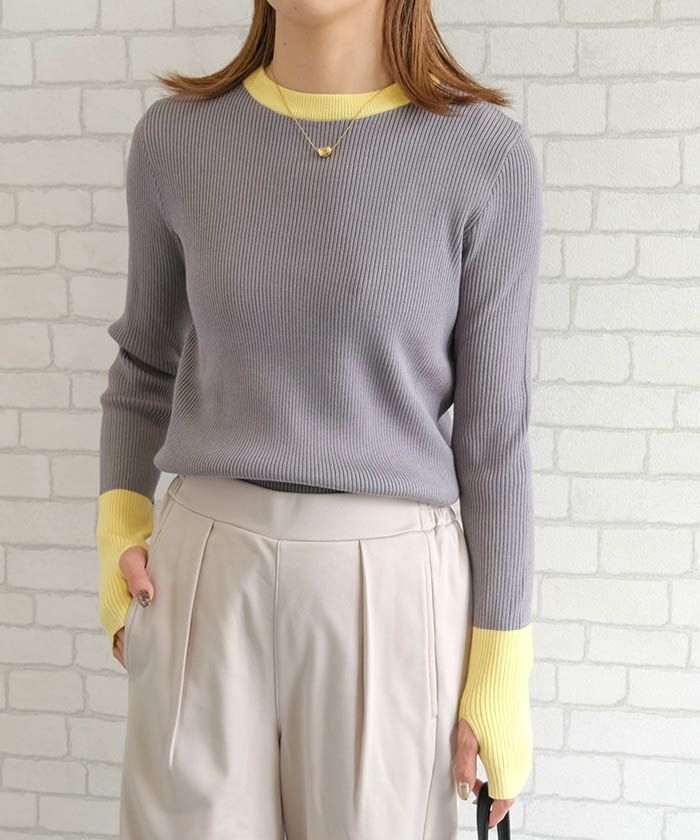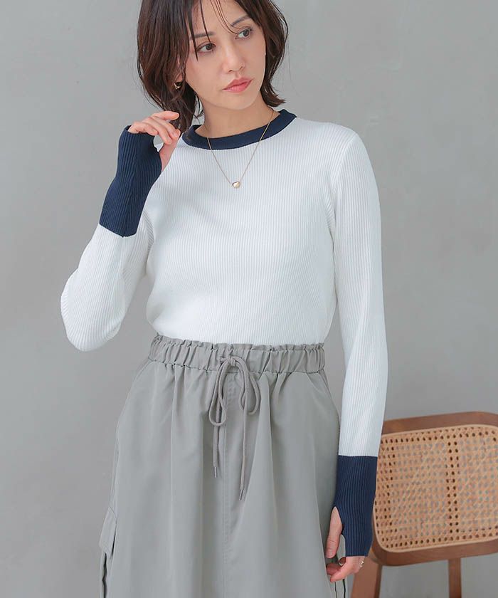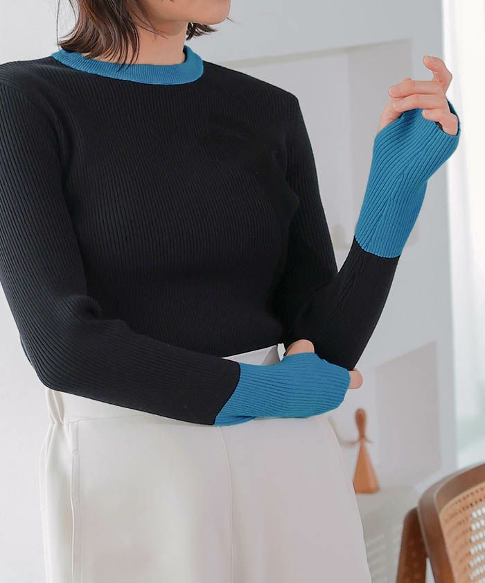 • 大胆な袖口の配色がアクセントの指穴付きバイカラーリブニット
