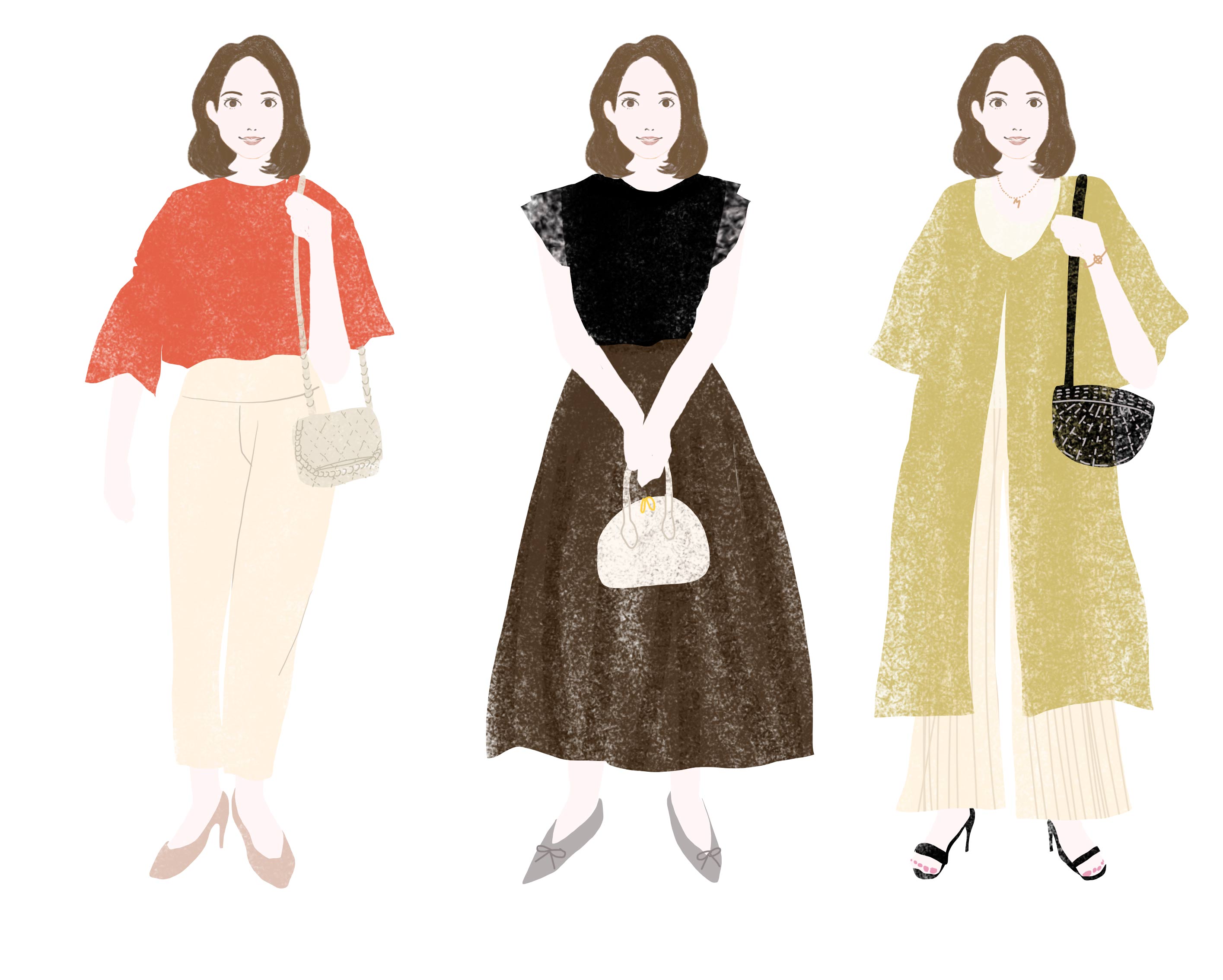 直線と曲線の両方をあわせ持つタイプなので、似合うファッションには幅があります。大人っぽく見せたいときはソフトエレガントにもっていきます。直線が多い人は、よりさっぱりとしたシンプルなもの、曲線が多い人は、キュートに近いスタイルも似合います。