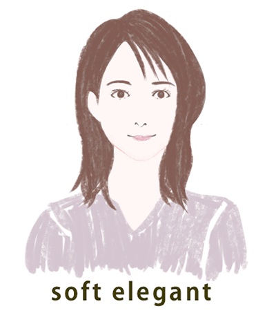 顔に長さがある大人バランスで、直線と曲線の両方をあわせ持つタイプです。このタイプの人は、ソフトで上品かつ落ちついた印象に見られます。また、パーツが小さめ~普通なので優しい印象になります。悩みとしては、必要以上におとなしく、真面目に見られることがあげられます。その場合は、エレガントにもっていきます。カジュアルにしたい場合は、フレッシュにもっていきましょう。