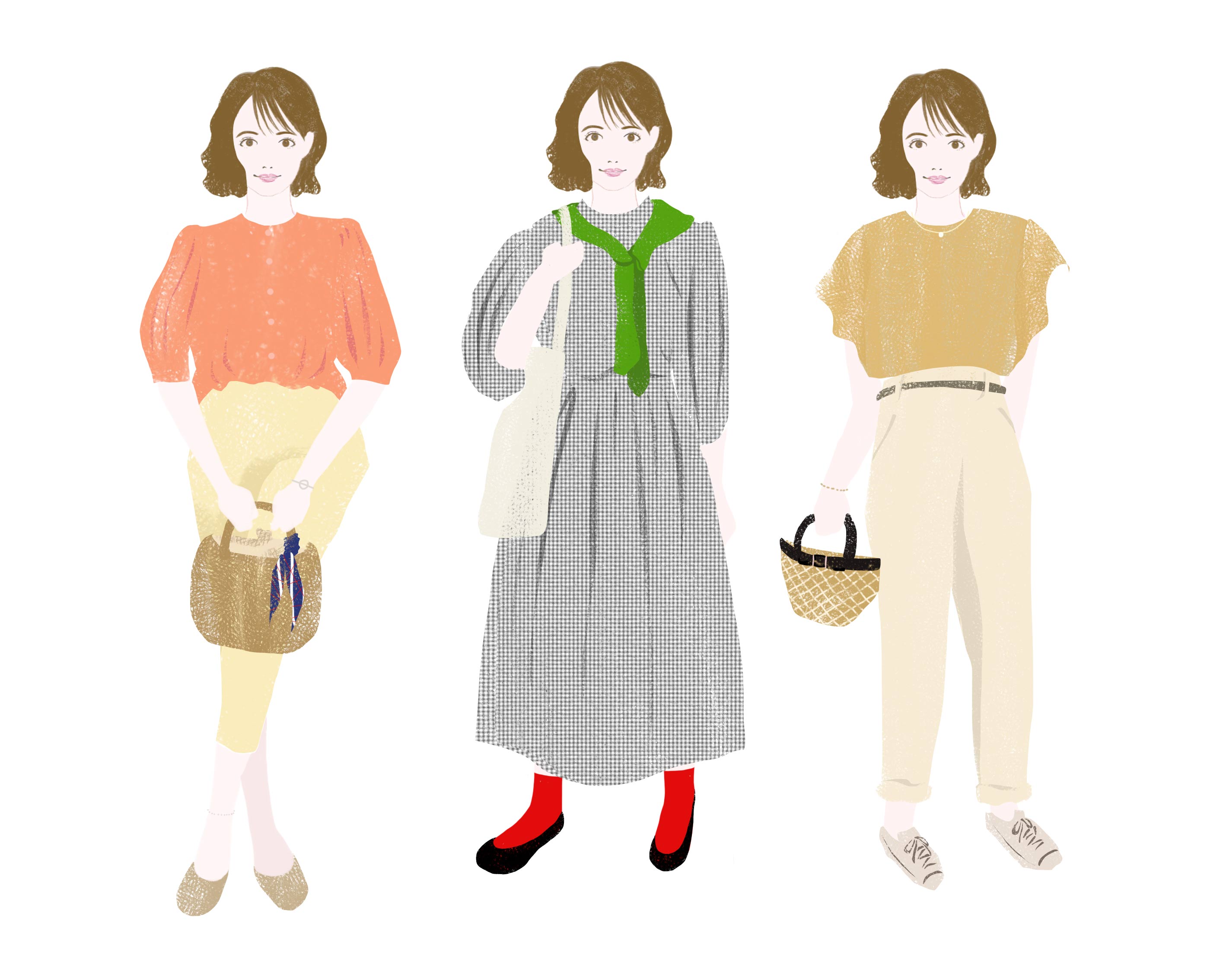 直線と曲線の両方をあわせ持つタイプなので、似合うファッションには幅があります。大人っぽく見せたいときはソフトエレガントにもっていきます。直線が多い人は、よりさっぱりとしたシンプルなもの、曲線が多い人は、キュートに近いスタイルも似合います。