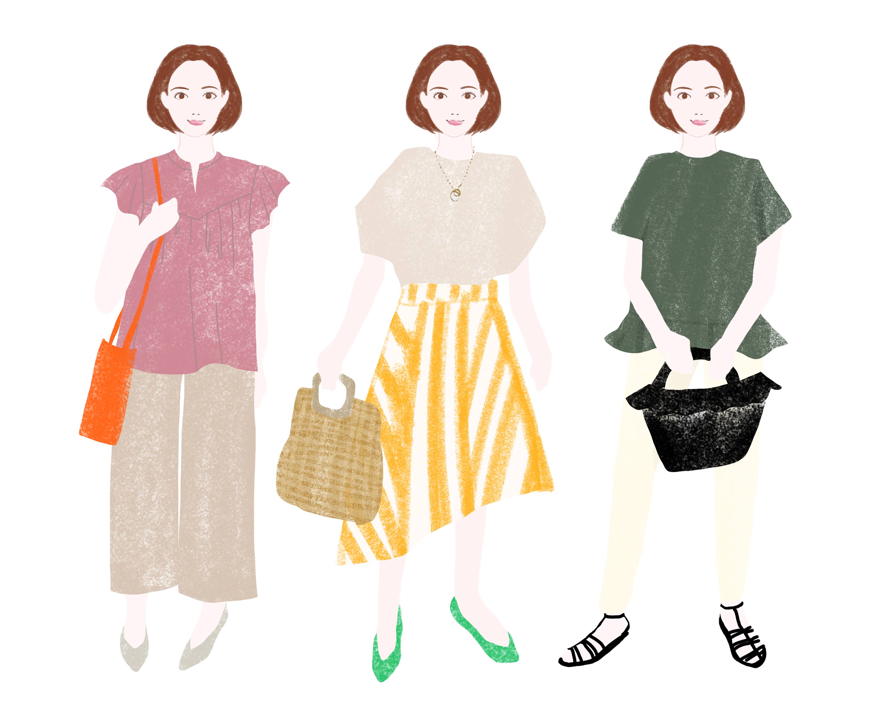 直線と曲線の両方をあわせ持つタイプなので、似合うファッションには幅があります。大人っぽく見せたいときはソフトエレガントにもっていきます。直線が多い人は、よりさっぱりとしたシンプルなもの、曲線が多い人は、キュートに近いスタイルも似合います。