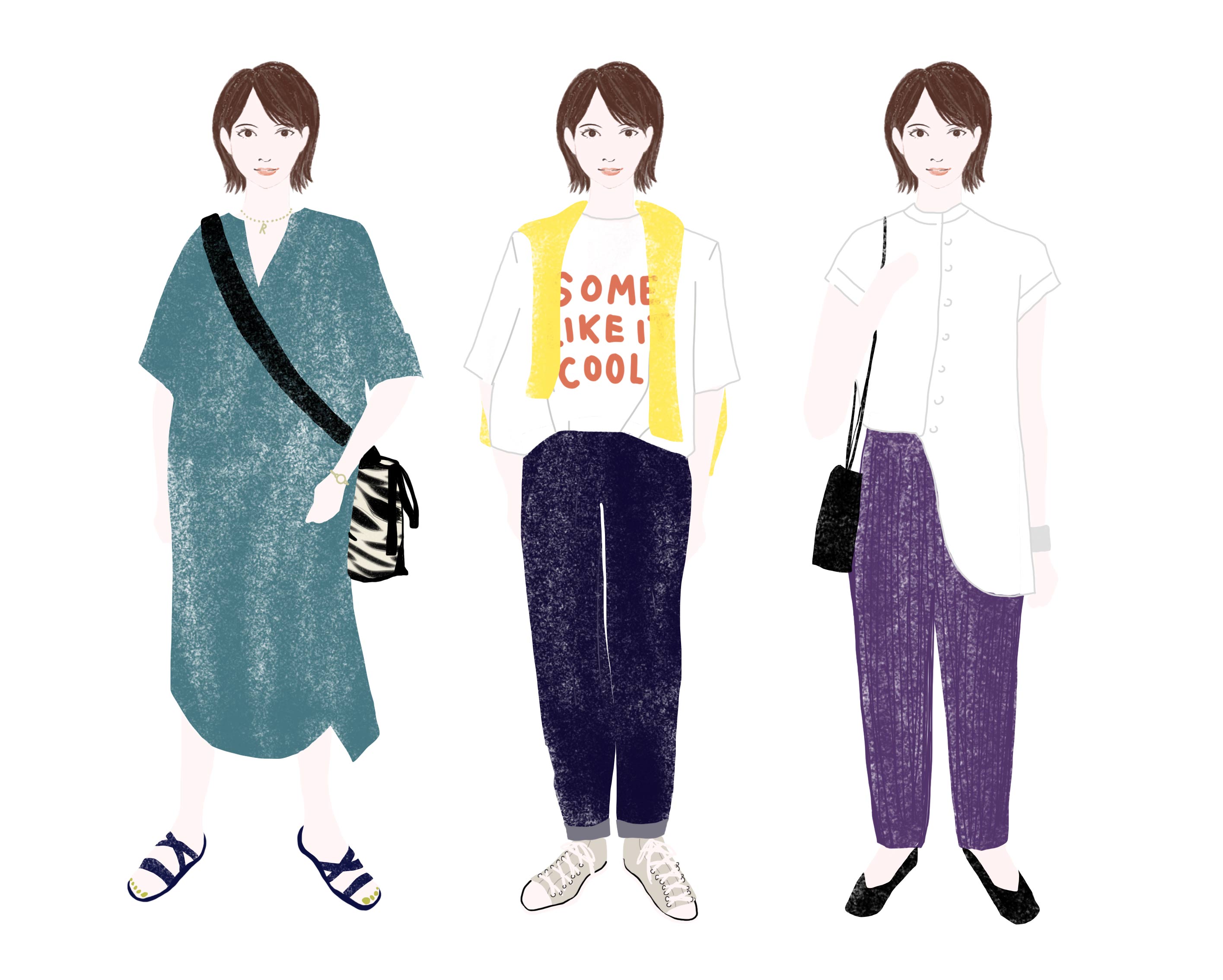 シンプルですっきりしたデザインが似合います。デコラティブなデザインやフリルの多いものは苦手です。また、ボーダー柄のT シャツやストライプのシャツワンピースのように、直線×カジュアルな着こなしが得意。子供タイプなのでパリッとした大人っぽいシャツよりは、スキッパーシャツのようにデザインか素材感がカジュアルなものを選ぶとよいでしょう。