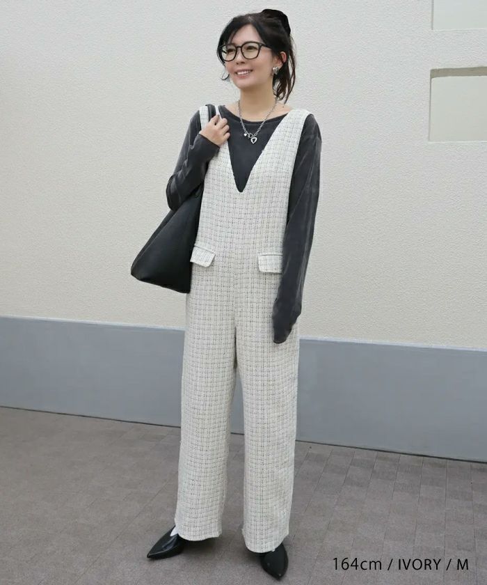 送料無料 ツイードVネックオールインワン レディース 春 秋 冬 M L | アクアガレージ aquagarage