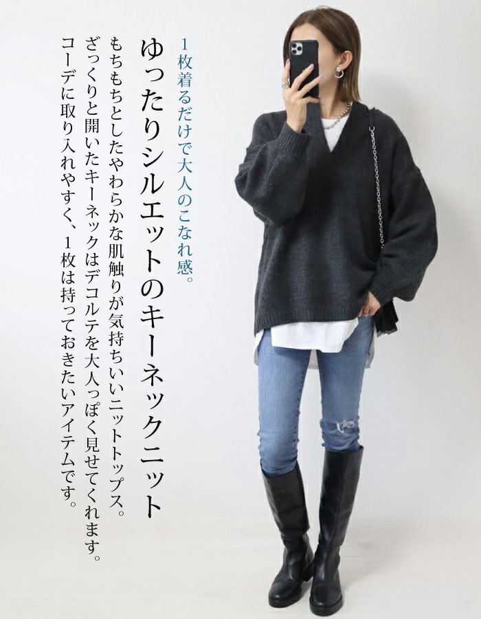 送料無料 ゆるシルエットキーネックニット レディース 秋 冬 長袖 チュニック | アクアガレージ aquagarage