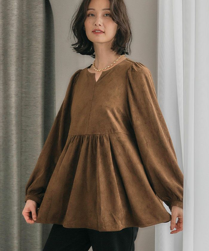 送料無料 スエードキーネックペプラムトップス レディース 春 秋 冬 M ≪ゆうメール便配送20・代引不可≫|アクアガレージ aquagarage